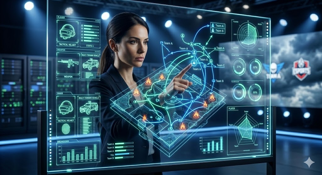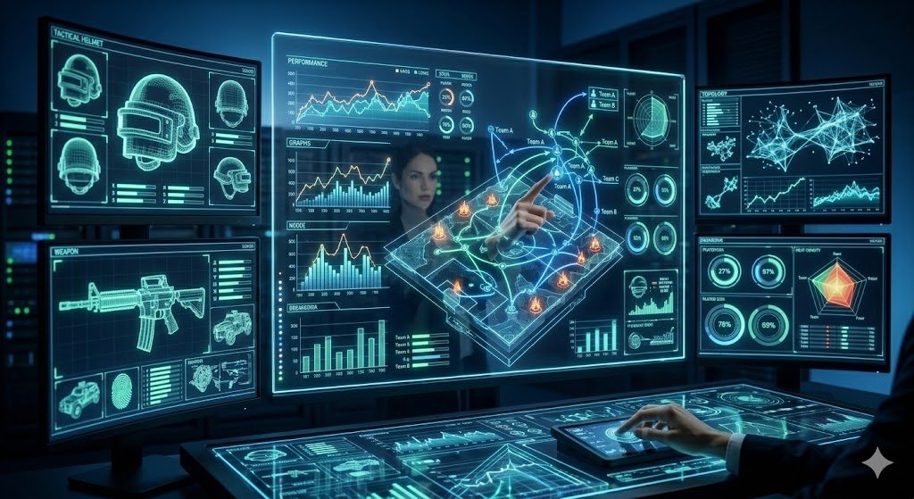 gaming-data-dashboard.jpg – «Et oversiktlig digitalt dashbord på et nettbrett som viser progresjon i PUBG Mobile og økonomisk oversikt over in-game kjøp.»